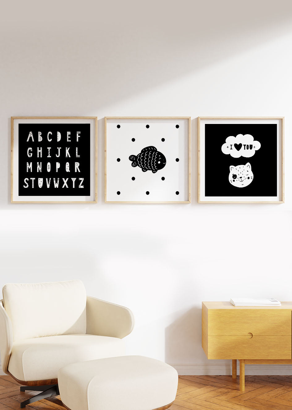 Utilizamos marcos de madera solida cortados con precisión por maquina para la creación de nuestros marcos. Actualmente están disponibles en diferentes acabados de madera, como negro, blanco y madera clara. Además, los marcos tienen caimanes de metal para colgarlos fácilmente.